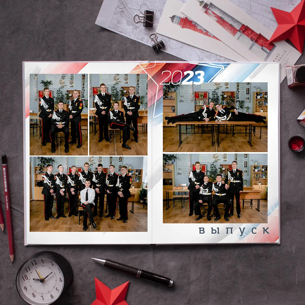 Окончательное размещение фотографий, цвет фона, наличие индивидуальных разворотов и количество страниц в альбоме согласовывается с каждым классом отдельно.