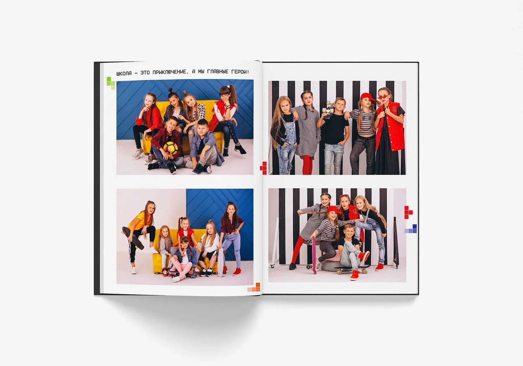 Окончательное размещение фотографий, цвет фона, наличие индивидуальных разворотов и количество страниц в альбоме согласовывается с каждым классом отдельно.