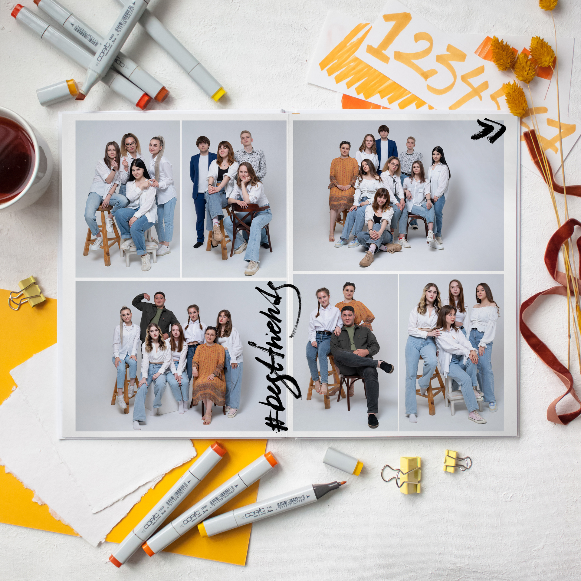 Окончательное размещение фотографий, цвет фона, наличие индивидуальных разворотов и количество страниц в альбоме согласовывается с каждым классом отдельно.