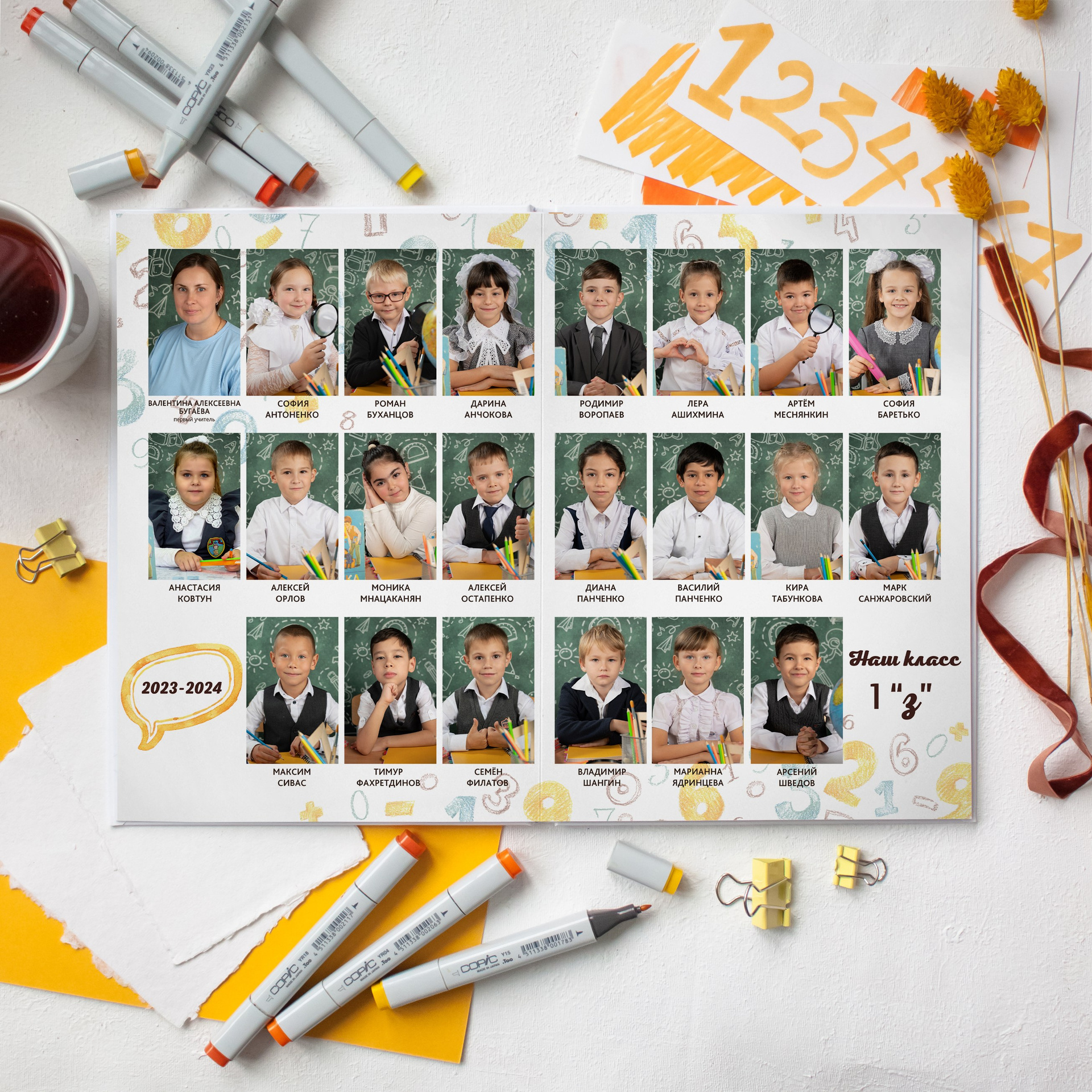 Окончательное размещение фотографий, цвет фона, наличие индивидуальных разворотов и количество страниц в альбоме согласовывается с каждым классом отдельно.