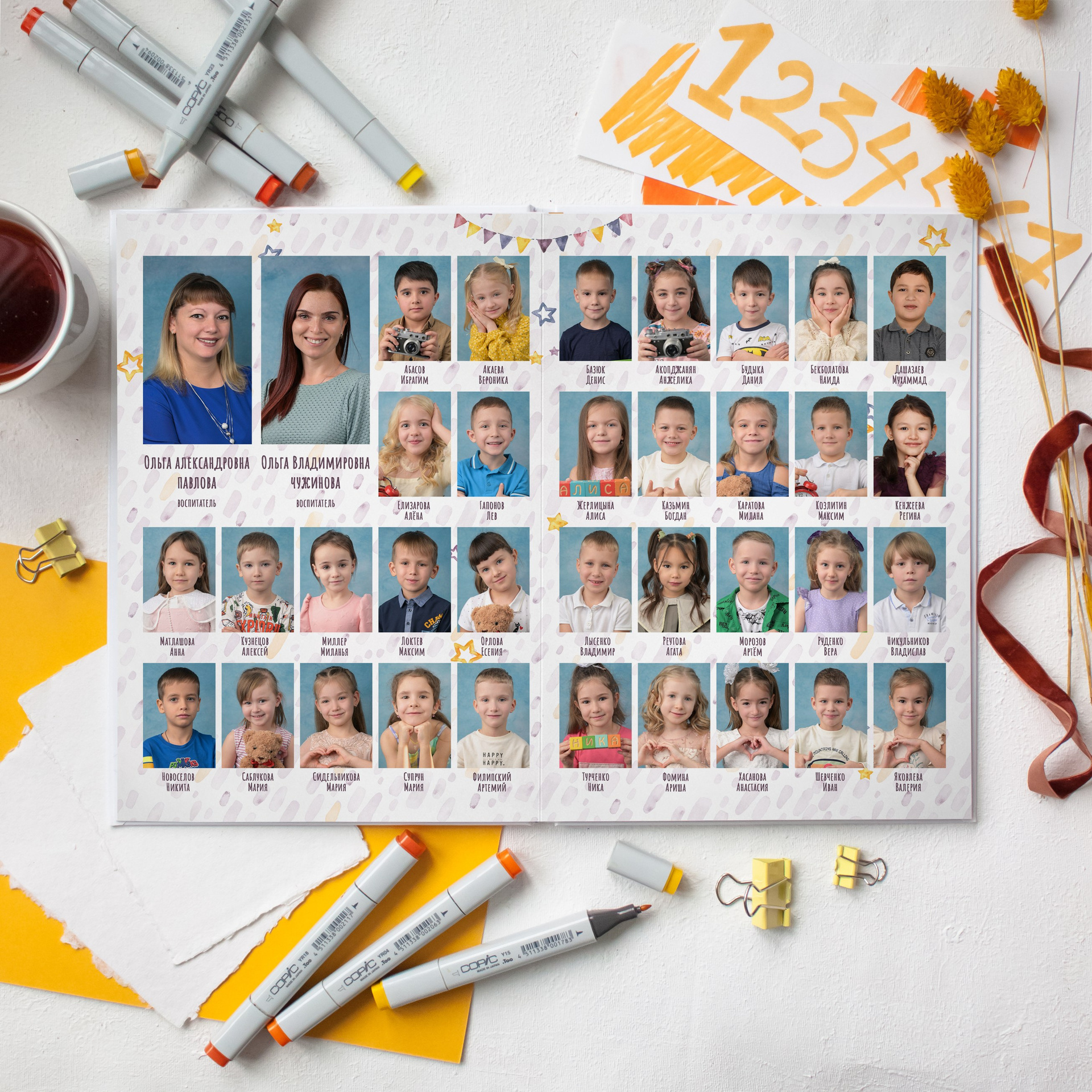 Окончательное размещение фотографий, наличие индивидуальных разворотов и количество страниц в альбоме согласовывается с каждой группой отдельно.